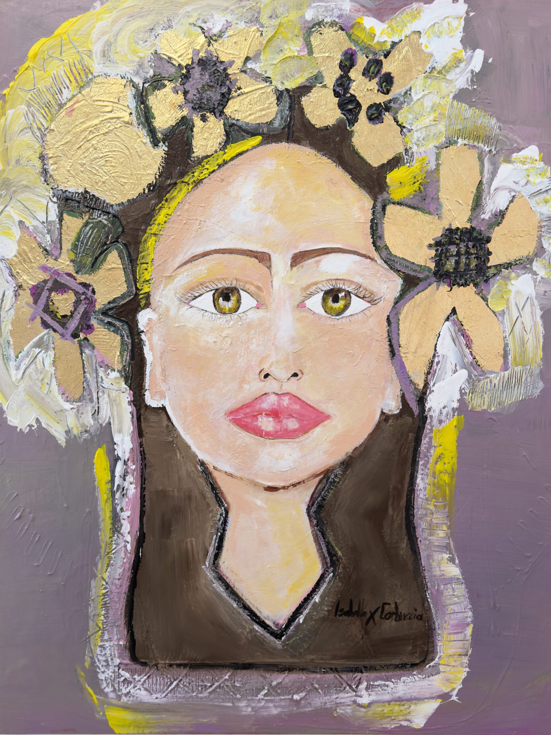 Technique mixte , peinture acrylique et feuille d’or 24 carats sur toile de lin.