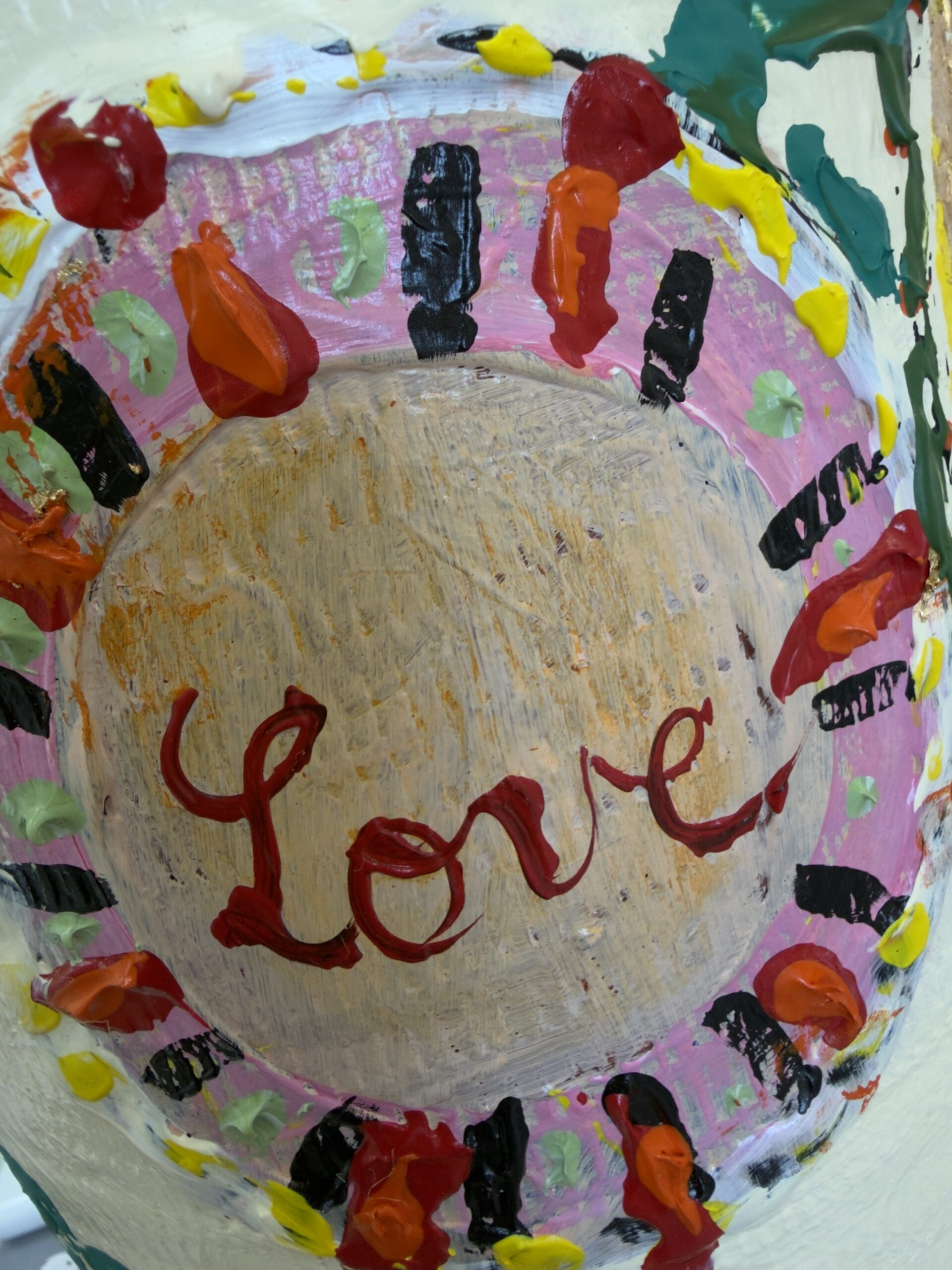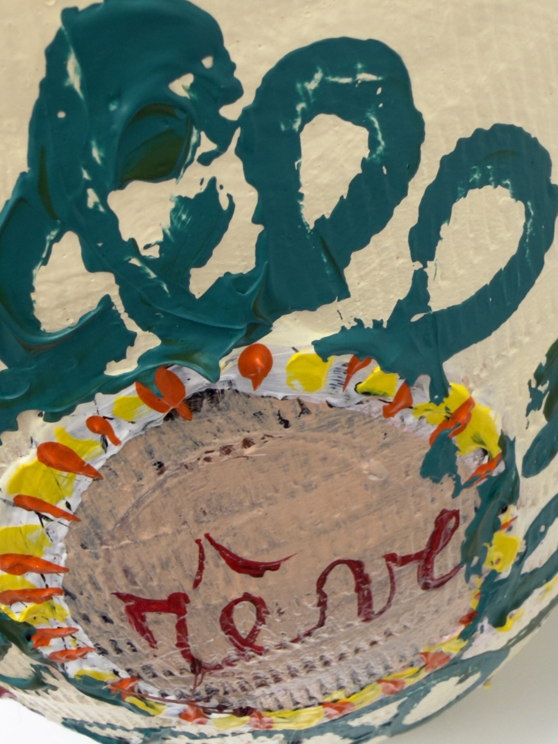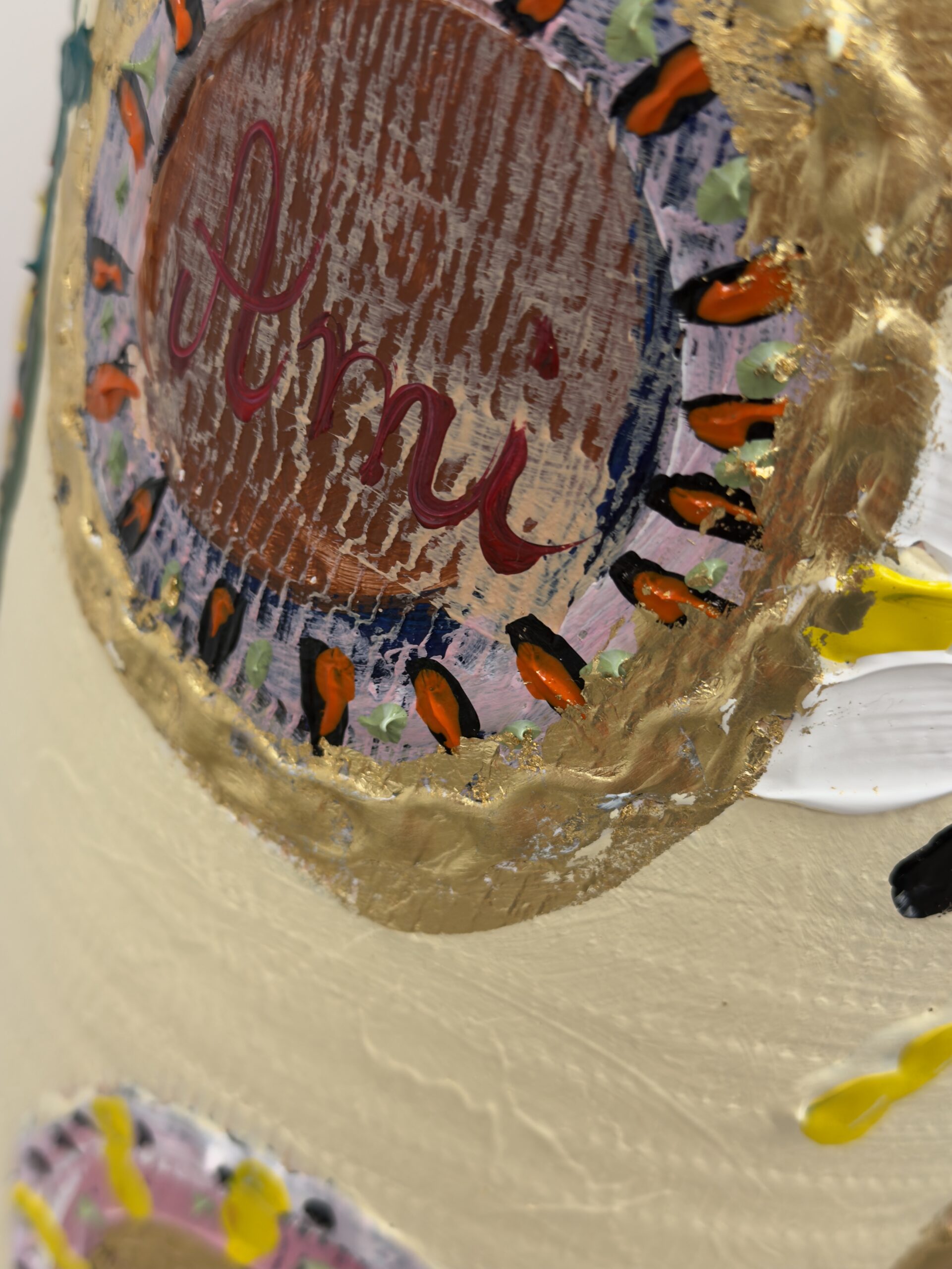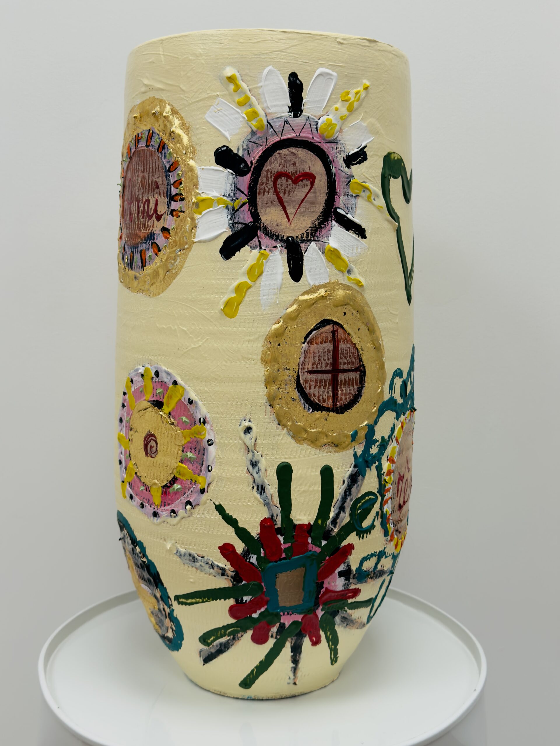 Vase en terre, peinture acrylique, feuille d’or et résiné