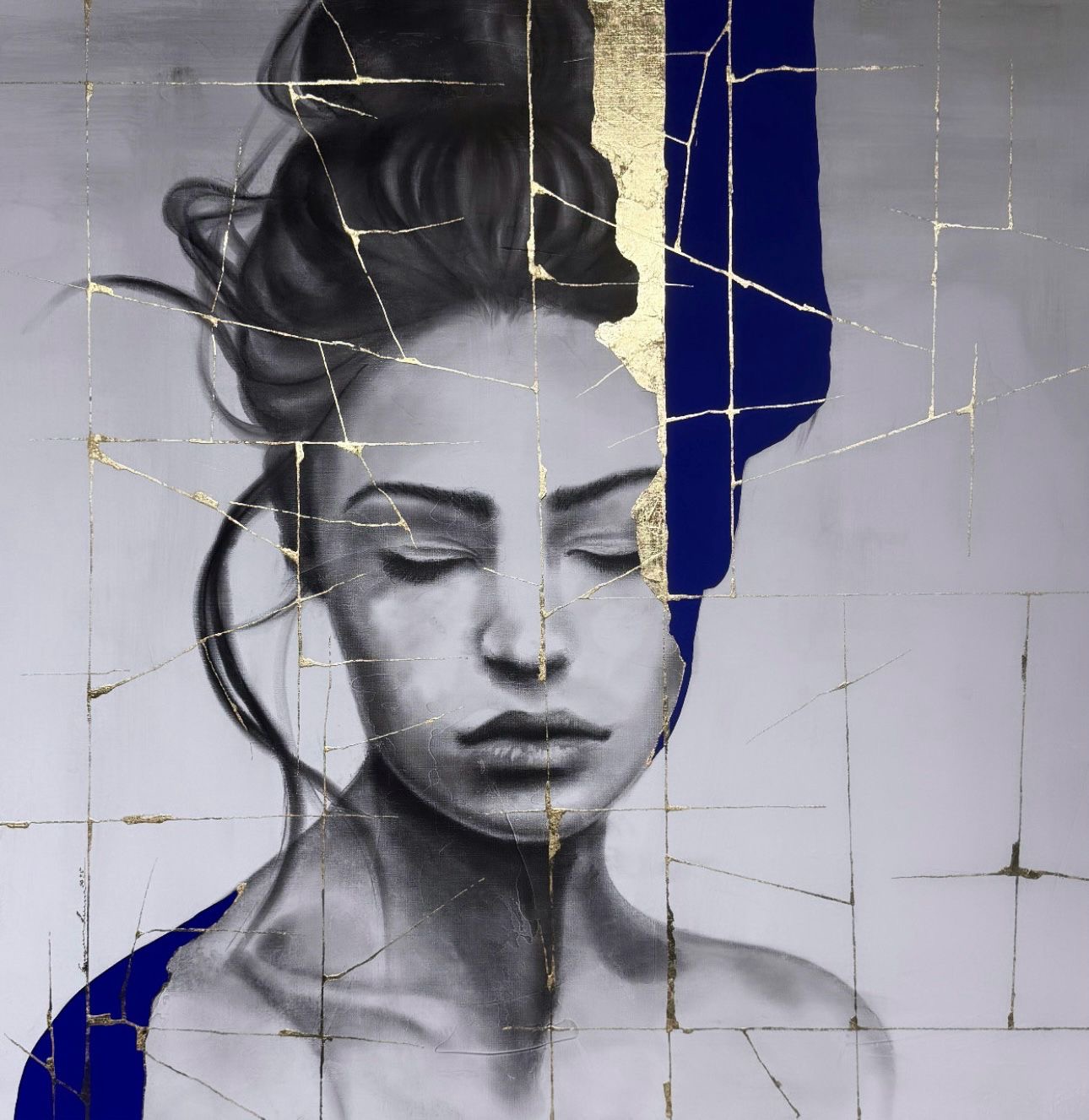 Technique mixte avec acrylique, fusain et feuille d’or 24 carats giusto Manetti sur toile de lin
