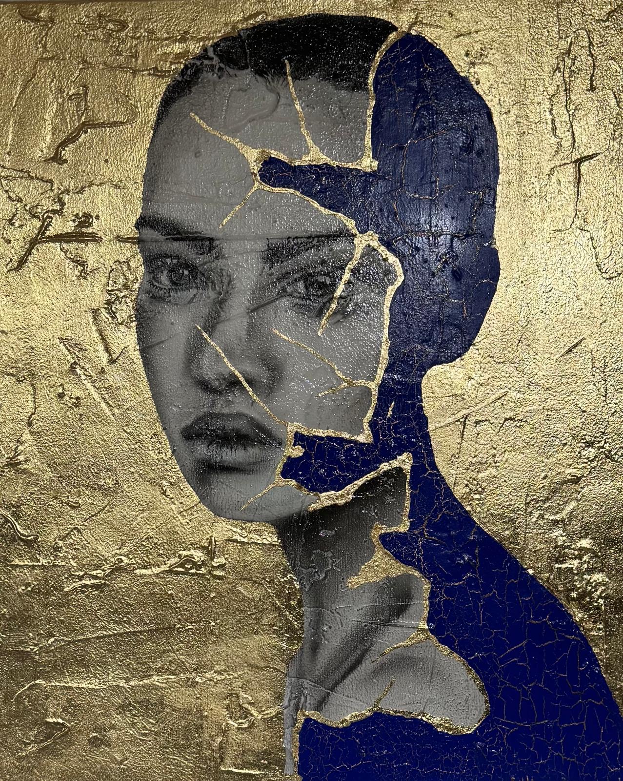 Technique mixte avec acrylique, fusain et feuille d’or 24 carats giusto Manetti sur toile de lin